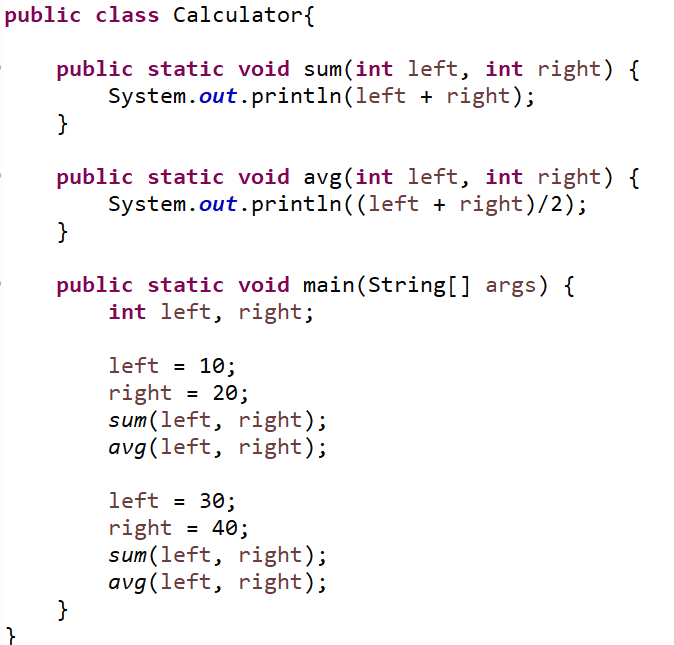 다른 누군가가 변수(left, right), 메소드(sum, avg)가 다른 의미로 사용할 수가 있고 버그로 이어진다.